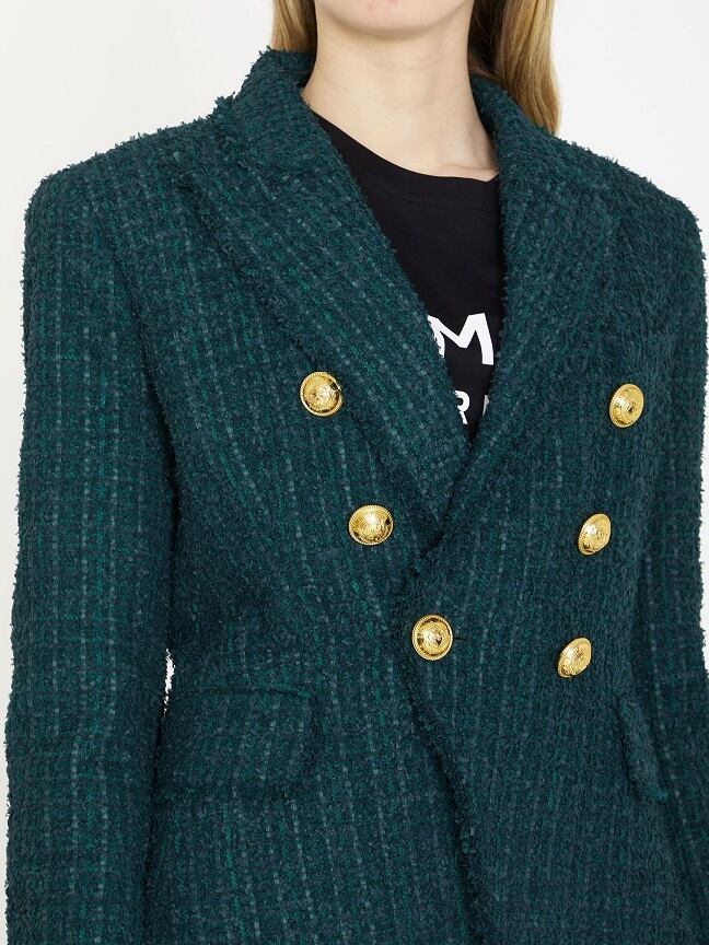 エンボス加工のゴールドトーンボタンが付いたグリーンツイードのダブルジャケット。