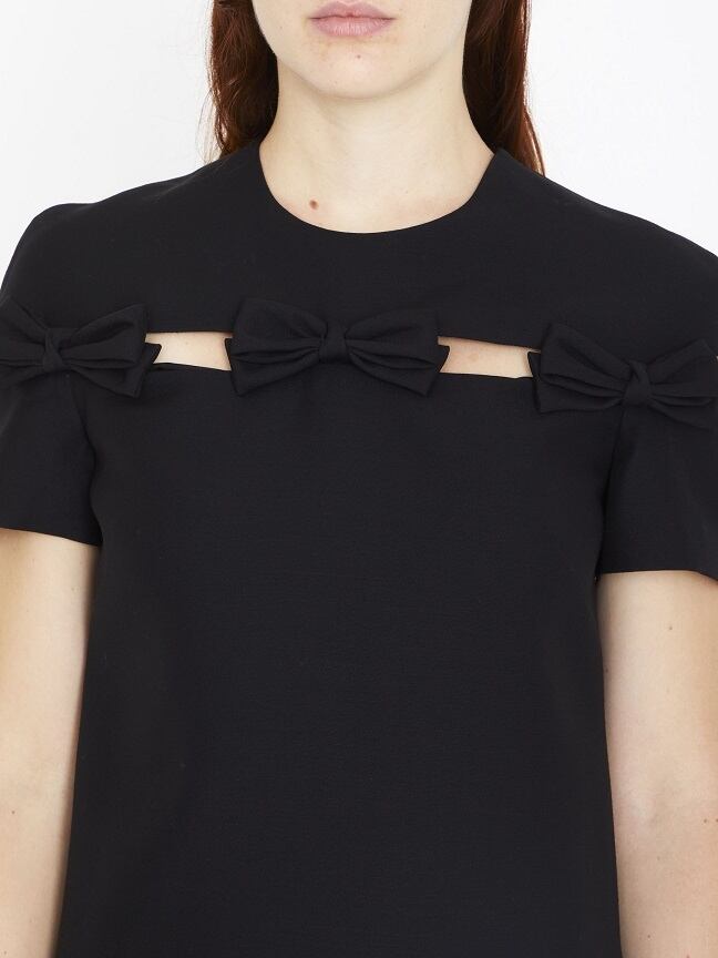 リボン付きのカットアウトディテールが施された、ブラックのクレープクチュールのヴァレンティノ ショート ドレス。