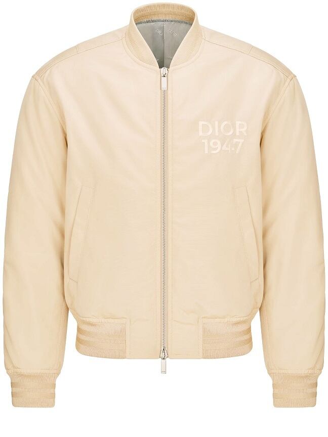 胸に Dior 1947 の刺繍、背中に Christian Dior Rue François 1er Paris 1947 の刺繍が入ったベージュのコットン混紡のボンバー ジャケット。