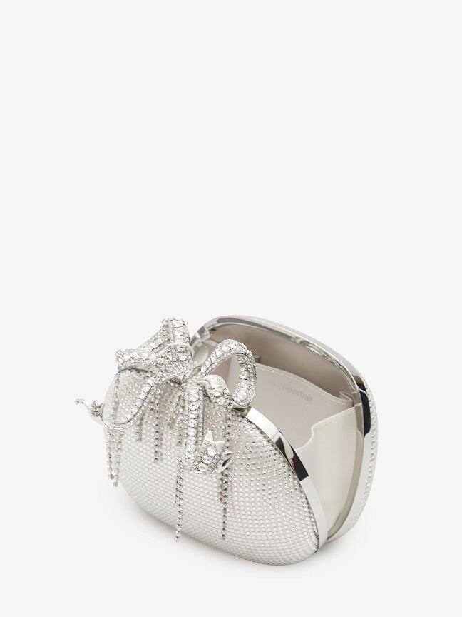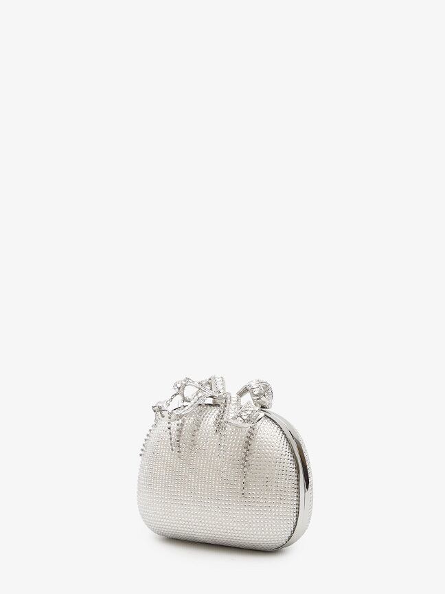 上部にリボンが付いたシルバーのラインストーンのラインストーンボウクラッチ。