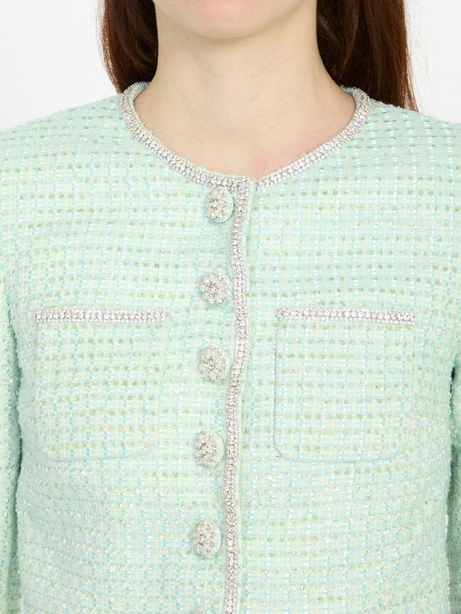 ジュエルトリムとジュエルボタンが付いたミントブークレジャケット。