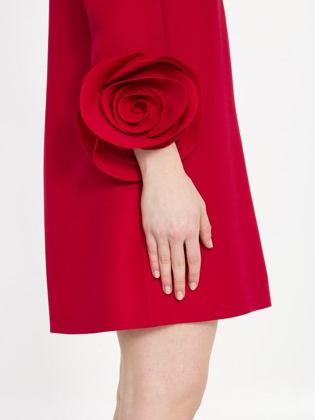 手首にバラのアップリケのディテールが施された、赤いクレープ クチュールのショート ドレス。