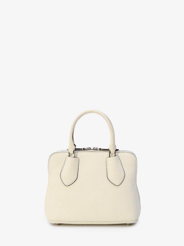 シルバートーンの金具が付いたホワイトグレインレザーのミニスイングバッグ。