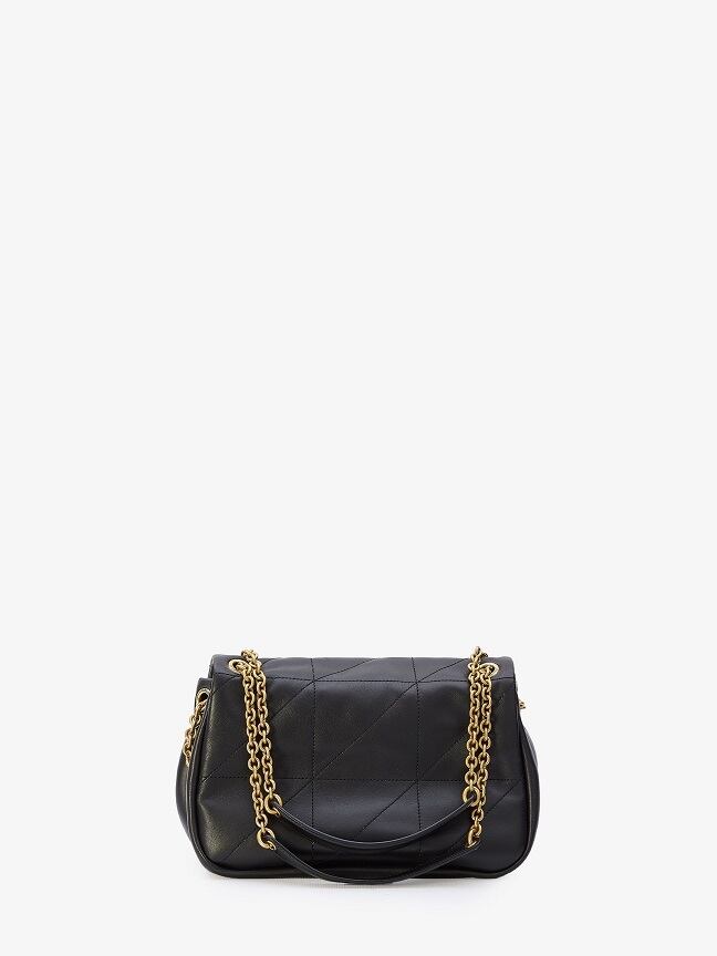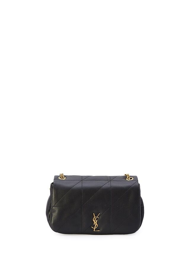 ジェイミー 4.3 スモール バッグは、前面にブロンズカラーのメタル YSL モノグラムが施された、柔らかいブラックのキルティング ラムスキン製です。