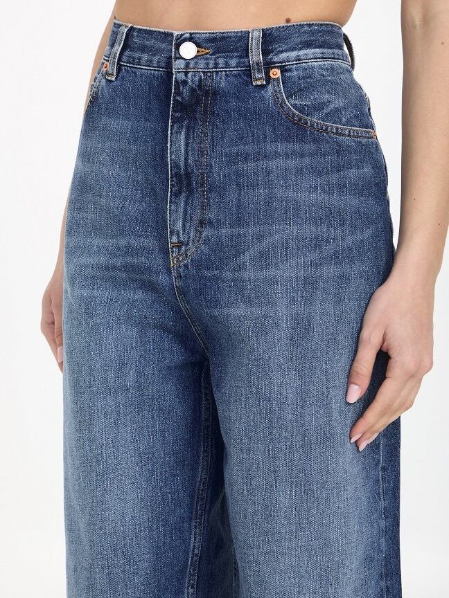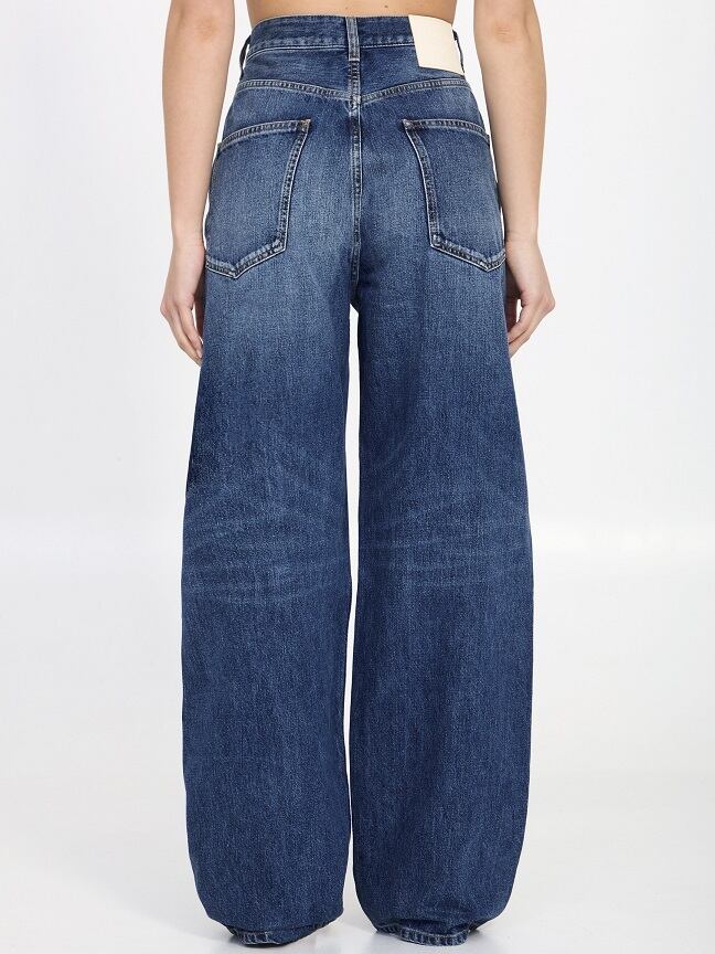 ミディアムブルーデニムのハイウエストワイドレッグジーンズ。