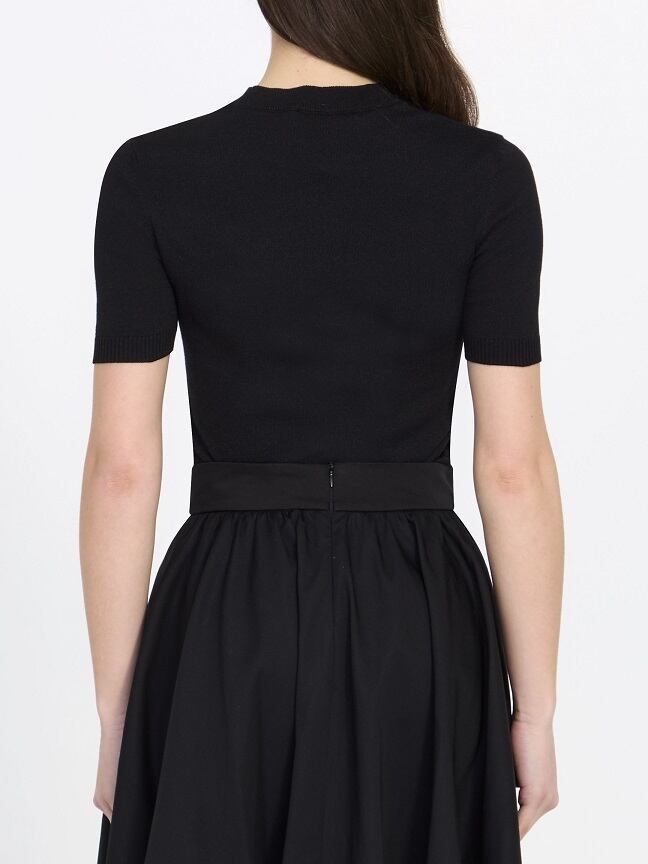 フロントにジャカード織りのPatouとJPをあしらった、ブラックの環境に優しいオーガニックコットン混紡ニットの半袖クルーネックトップ。