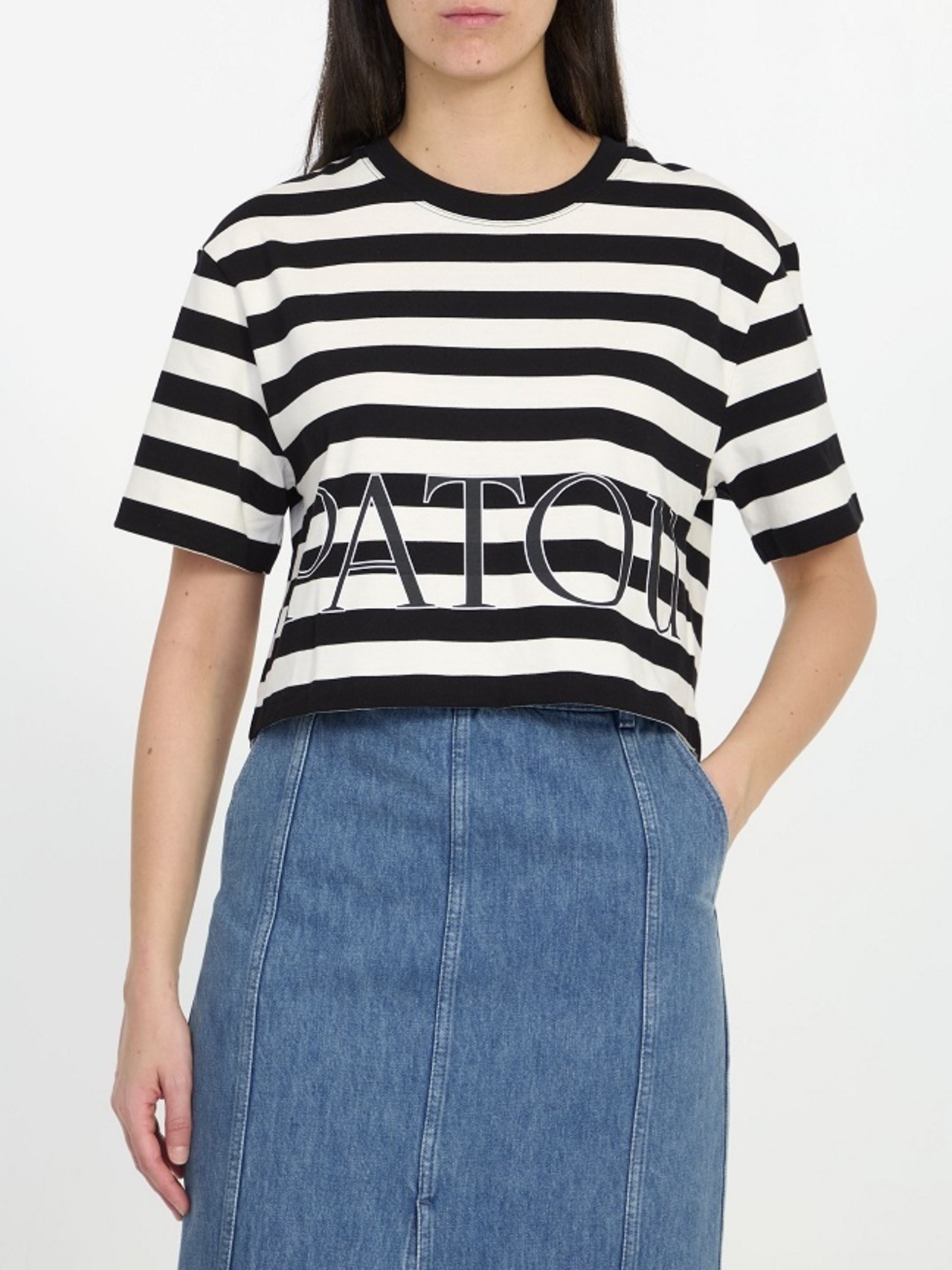 前面にパトゥのプリントが施された、黒と白のストライプのコットン製、半袖クルーネック ブレトン クロップド T シャツ
