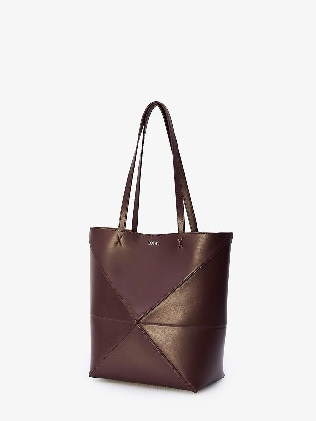 エンボス加工のゴールドトーンのロエベロゴが入ったバーガンディのシャイニーカーフスキン製パズルフォールドトートバッグ。