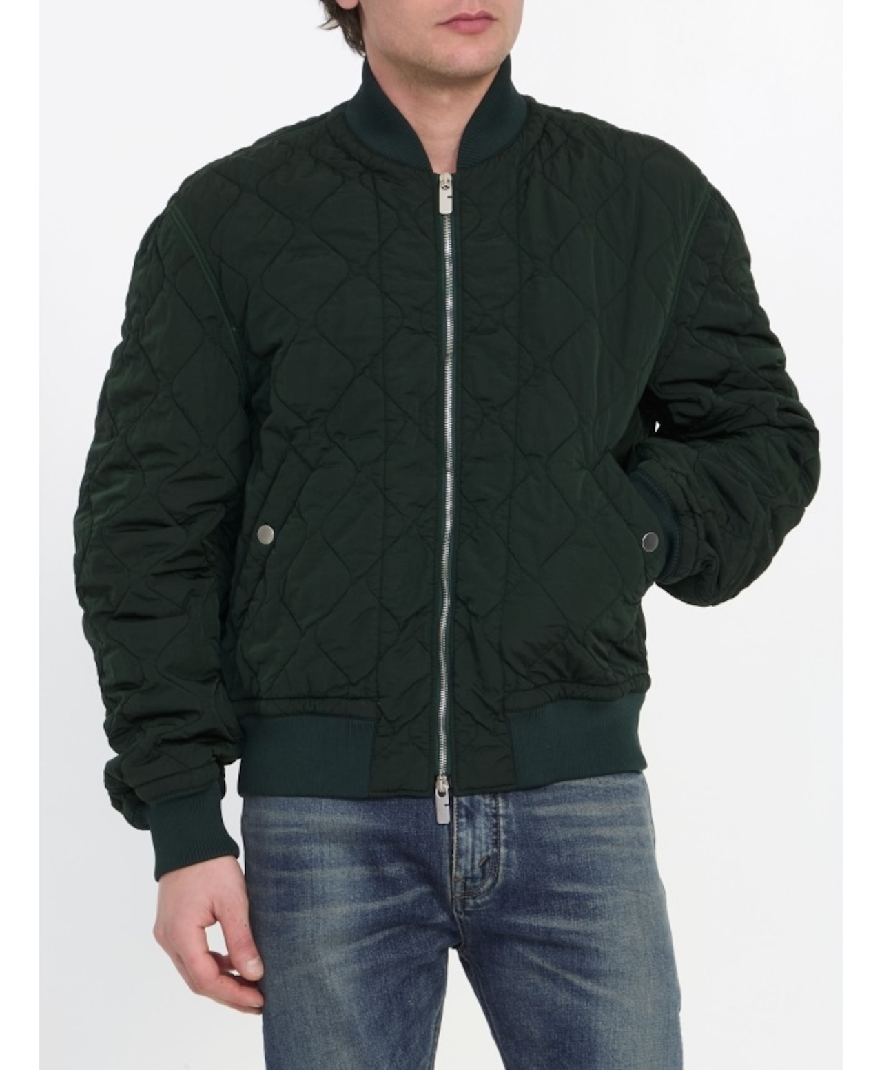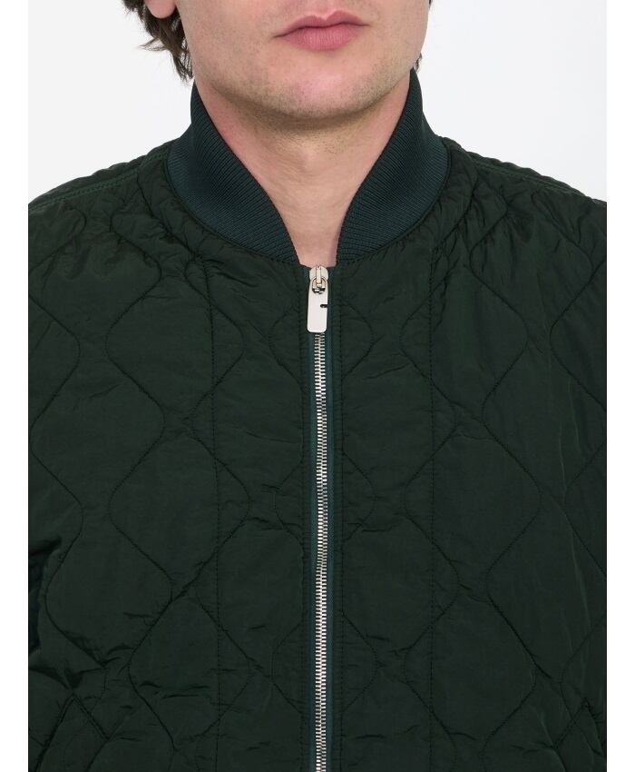 グリーンのシワ加工を施したキルティングナイロン製のボンバージャケット。