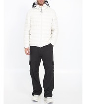 ホワイトのリサイクルポリエステル製、ダウン中綿入りのコーナーショートダウンジャケット。