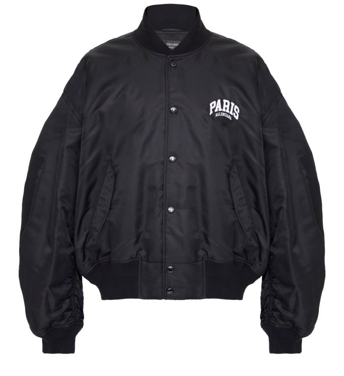 胸と背中にパリ バレンシアガの刺繍が入ったブラック ナイロン製のバーシティ ジャケット。