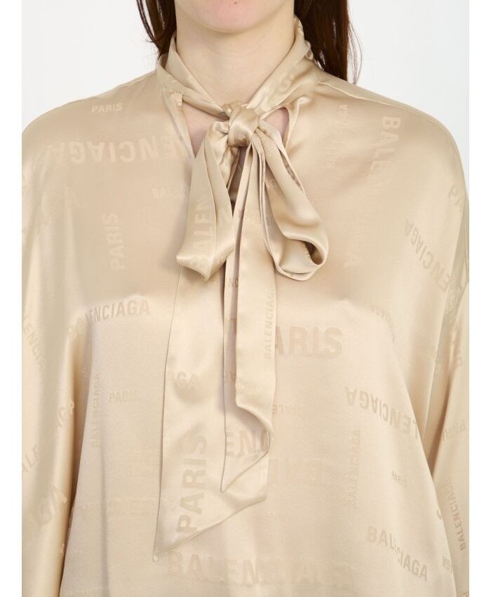 全体にバレンシアガのロゴが入ったシャンパンカラーのシルク製ヴァルーズ シャツ。