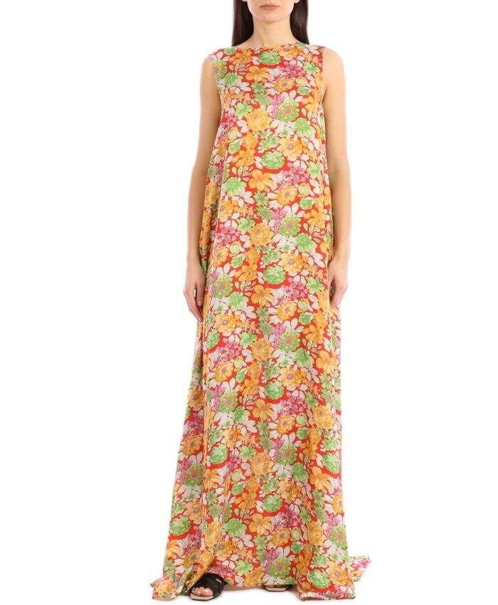 全体に花柄プリントが施されたマルチカラーのマキシドレスです。