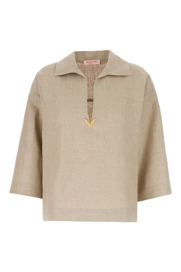 前面にメタルのVロゴディテールをあしらったピュアリネン製のオーバーサイズブラウス。