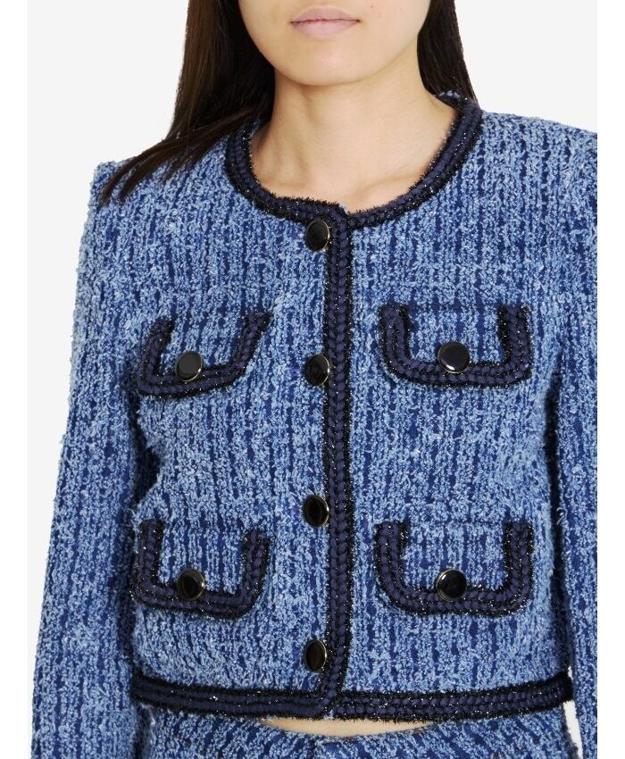 編み込みトリムが付いたブルーのテクスチャードデニムクロップジャケット。