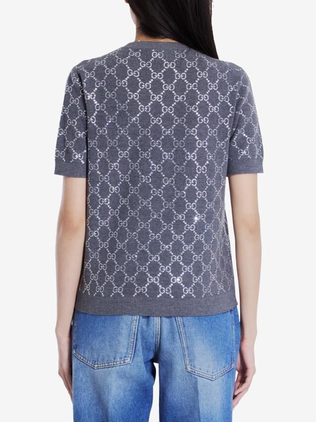 全体にラインストーンのGGモチーフが施された、グレーのウール製半袖クルーネックセーター。