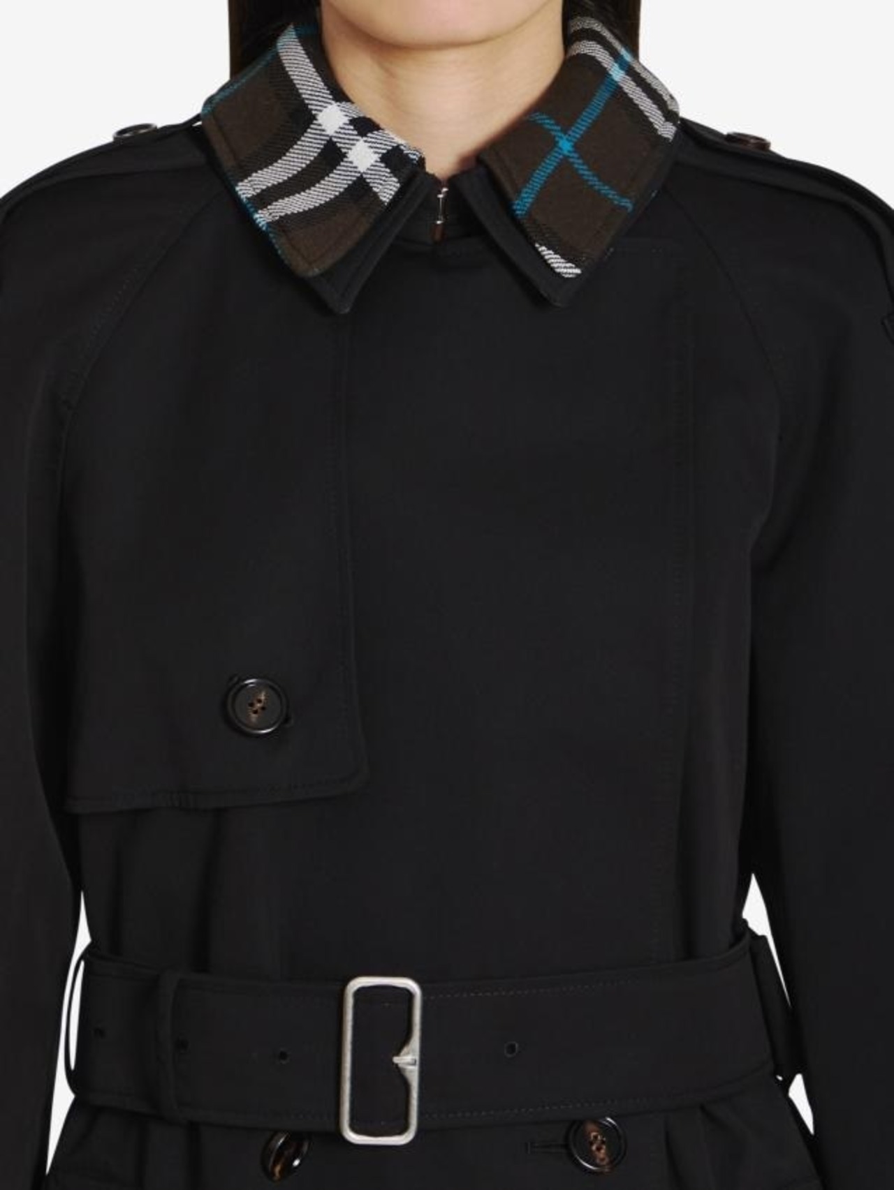 襟に取り外し可能なチェックのインサートが付いた、ブラックのコットン製レインコート。