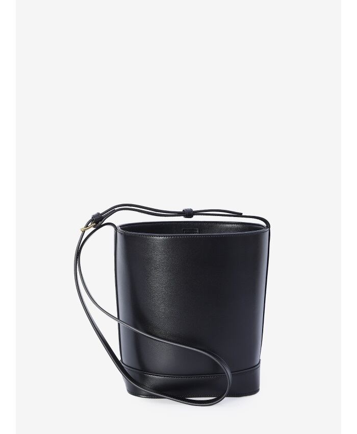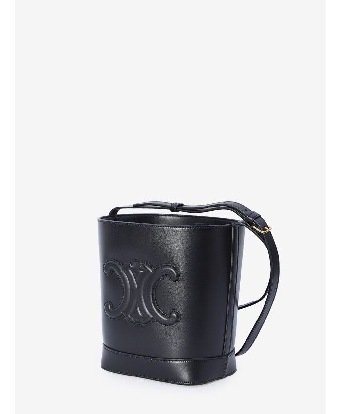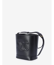 前面にTriompheのエンボス加工を施したブラックのスムースカーフスキン製スモールバケットバッグ。