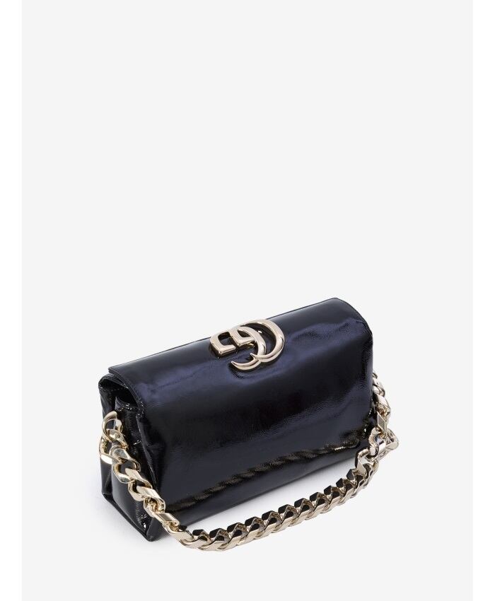 ライトゴールドトーンの金具が付いたブラックのパテントレザー製の小さなショルダーバッグ。