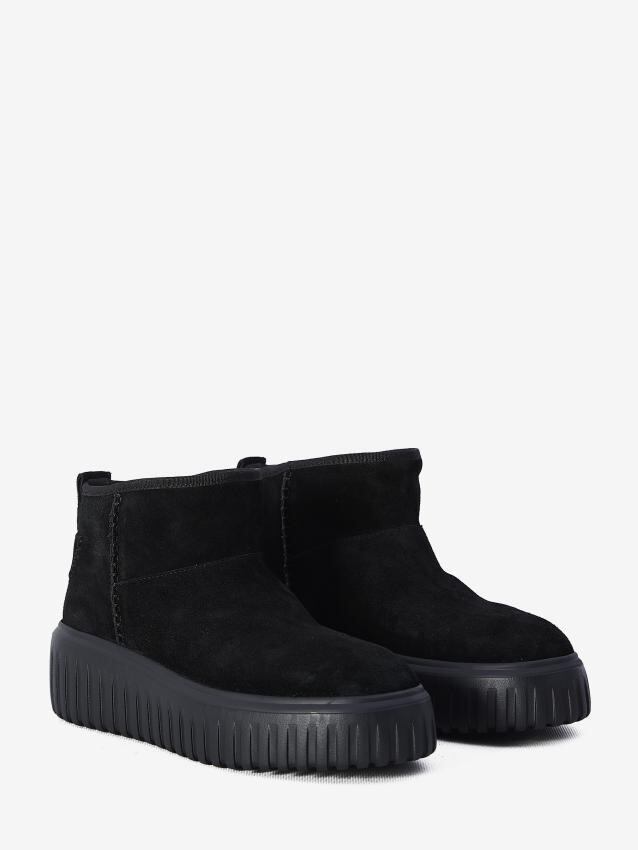 ブラック スエードの H ストライプ ロートップ ブーツ。