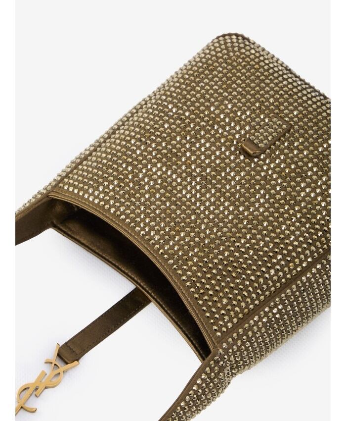 Le 5 à 7 全体にラインストーンが施されたブラウンのシルクサテンのしなやかなベビーバッグ。