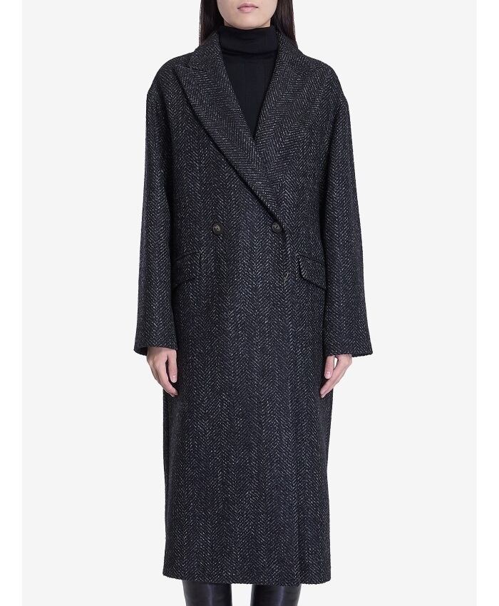 グレーとブラックのヘリンボーンウール混紡のロングコート。