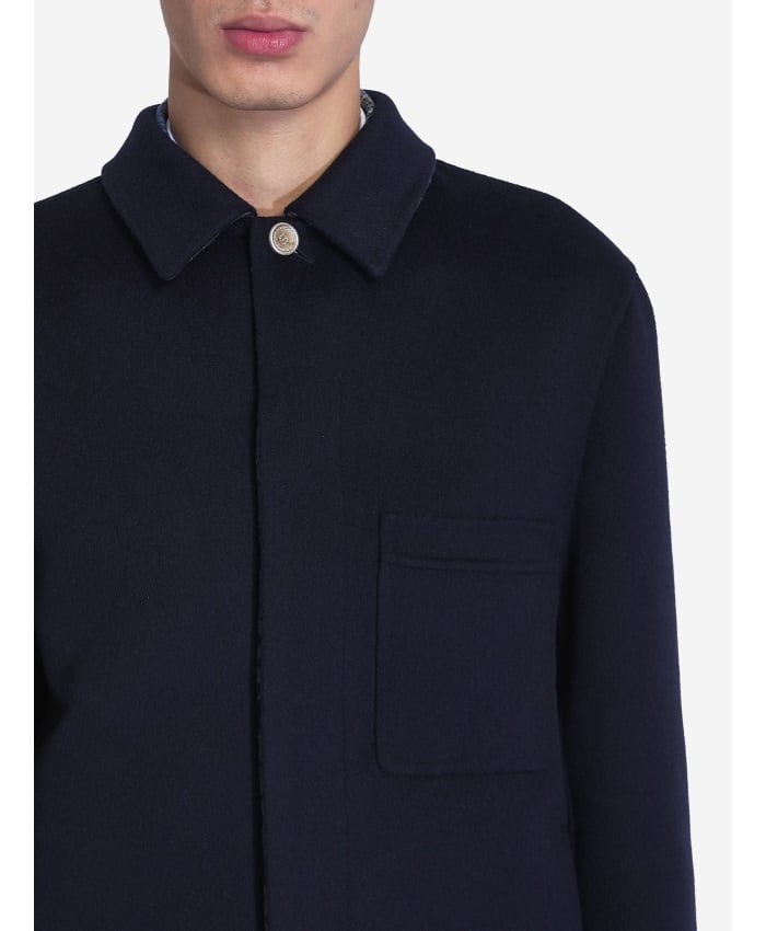 ディオール アイコンのワークウェア ジャケットは、ネイビー ブルーの両面バージン ウールとカシミアを使用しており、外側は無地、内側はディオール オブリークです。